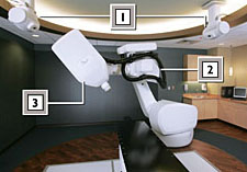 Throughout the treatment, image guidance cameras [1] automatically locate and track the position of the tumor, and the system automatically corrects for any patient or tumor movement. During the procedure the patient lies comfortably on the table while the computer-controlled robotic arm [2] moves around the patient and the X-ray machine delivers converged beams of radiation to precisely defined areas from a variety of angles and multiple positions. The CyberKnife system uses a high-energy X-ray machine [3] on the robotic arm to deliver the radiation beams that will kill the tumor cells.