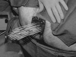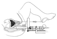 This is a side view of a LDR implant procedure. An ultrasound probe placed into the rectum guides needles into the prostate, where radioactive seeds” are deposited.