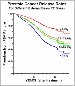 This graph shows the proportion of patients free from a recurrence of prostate cancer in the years following various doses of external beam radiotherapy. If an EBRT treatment is curative, the downward trend should level off and become a horizontal line (which corresponds with the cure rate). As shown, prostate cancer treated with a higher dose (80 Gy or greater) takes longer to recur, but there is no clear leveling off. This suggests even the highest doses of external beam radiotherapy may be insufficient to cure prostate cancer. (Data from Fox-Chase Cancer Center. Nadir+2 definition for biochemical failure used. Adapted from Eade IJROBP 68(3), 682-89.)